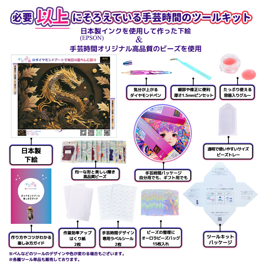 ★内容:台紙、ビーズ(スクエア)、ダイヤモンドペン、ビーズトレー、容器入りグルー、ピンセット、専用ラベルシール、ビーズバッグ、はくり紙、楽しみ方ガイド