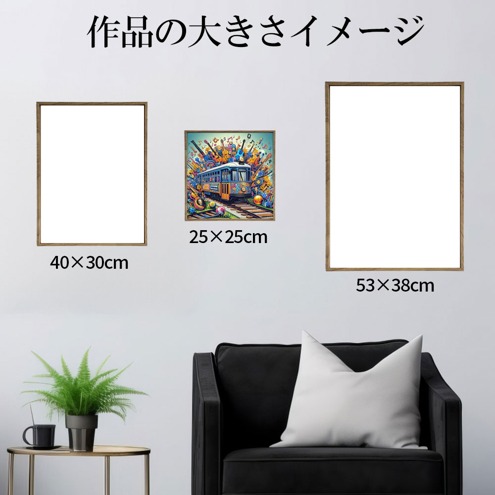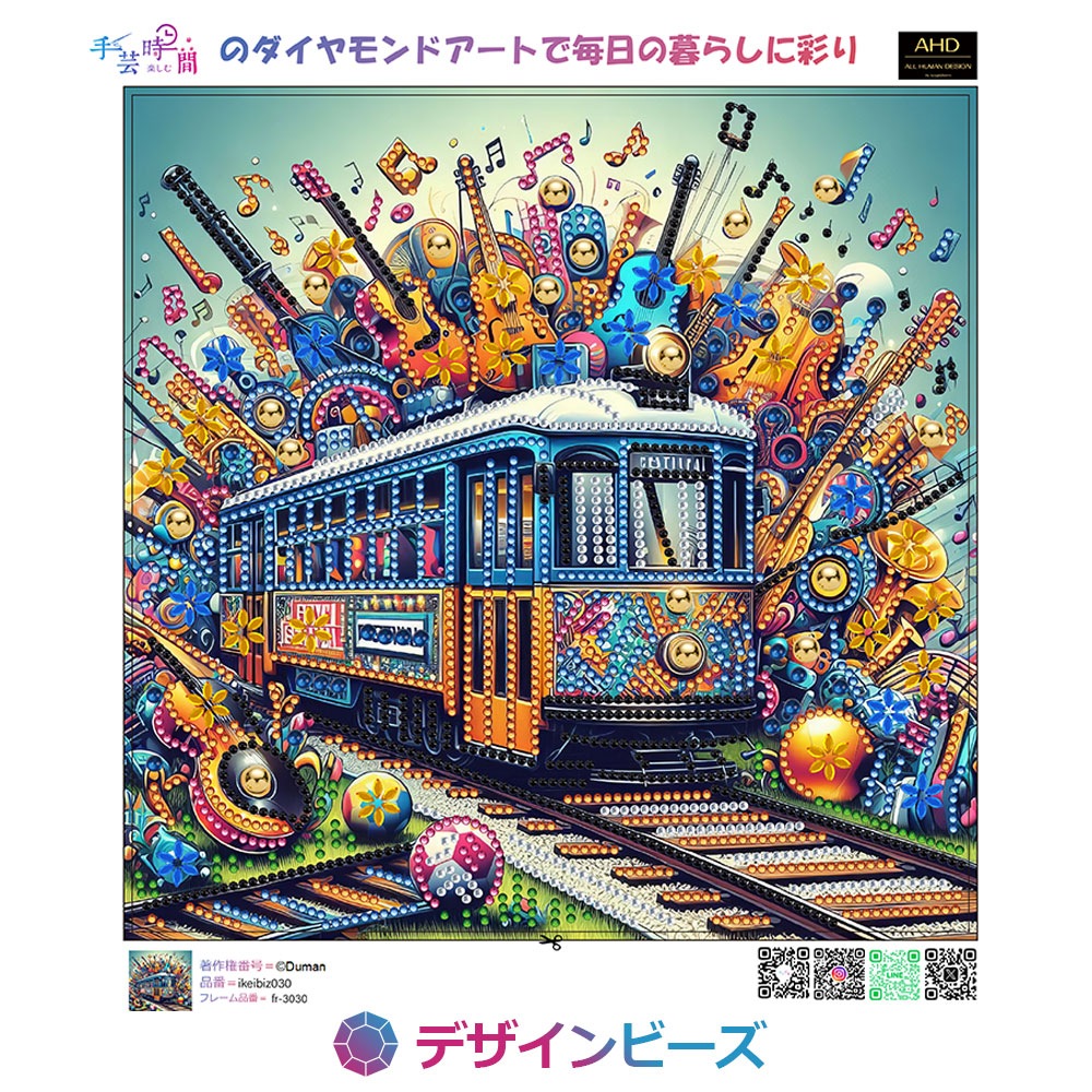 ★たくさんの楽器や音符の中を走る列車。カラフルでポップアートのような楽しい一枚。