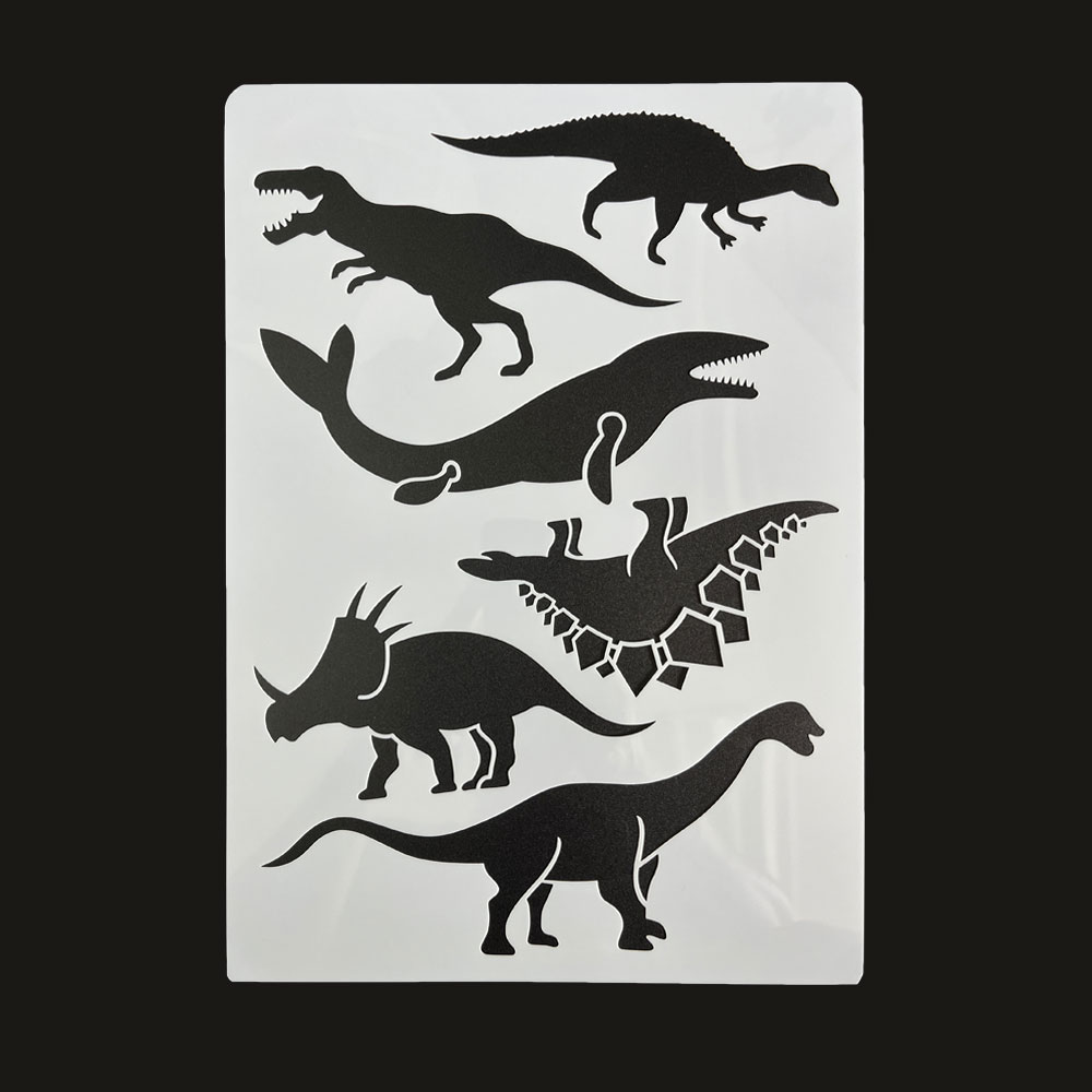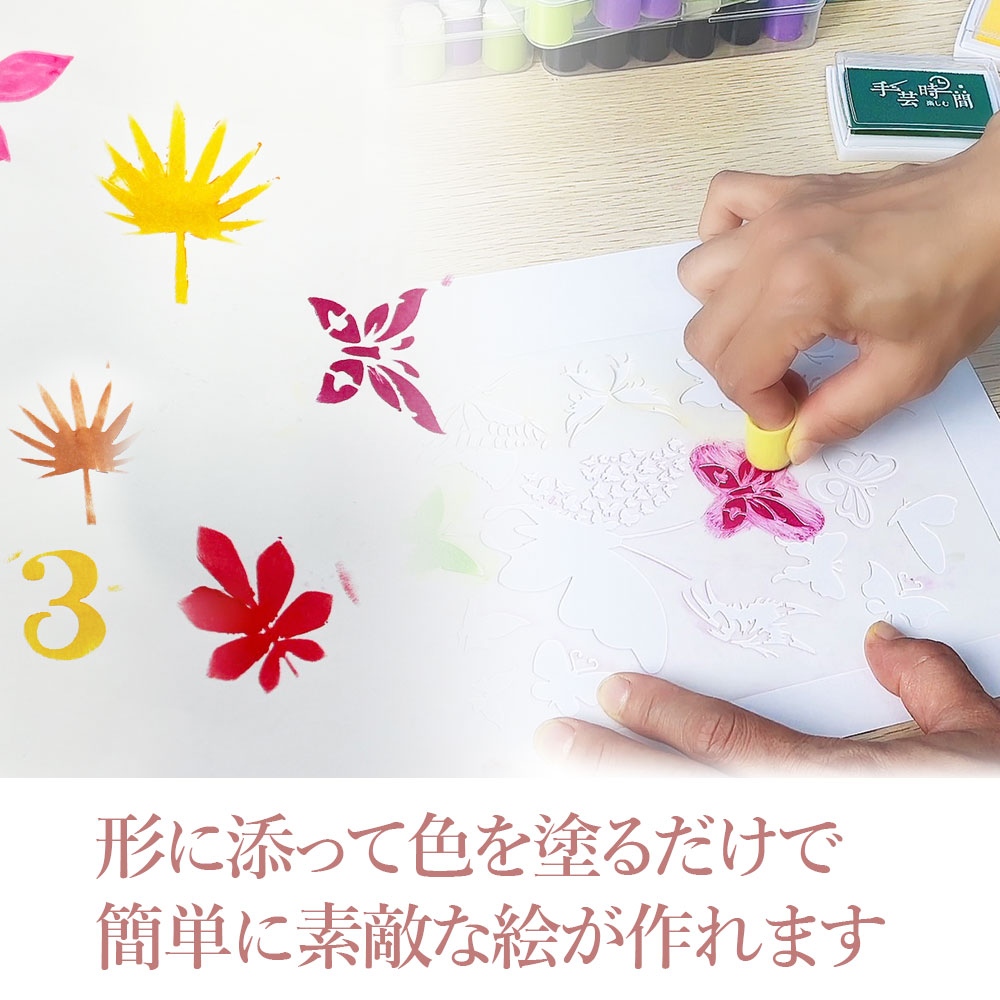 形に添って色を付けるだけで、様々な生き物の絵が作れるステンシルシートです。
