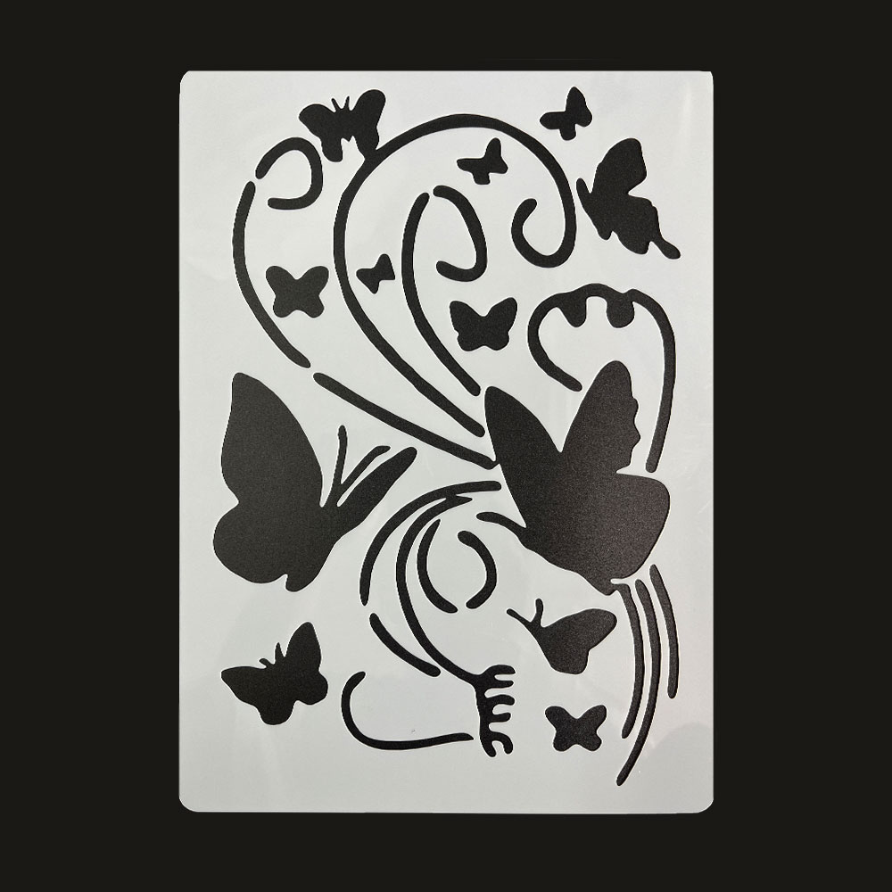 形に添って色を付けるだけで、蝶々の絵が作れるステンシルシートです。