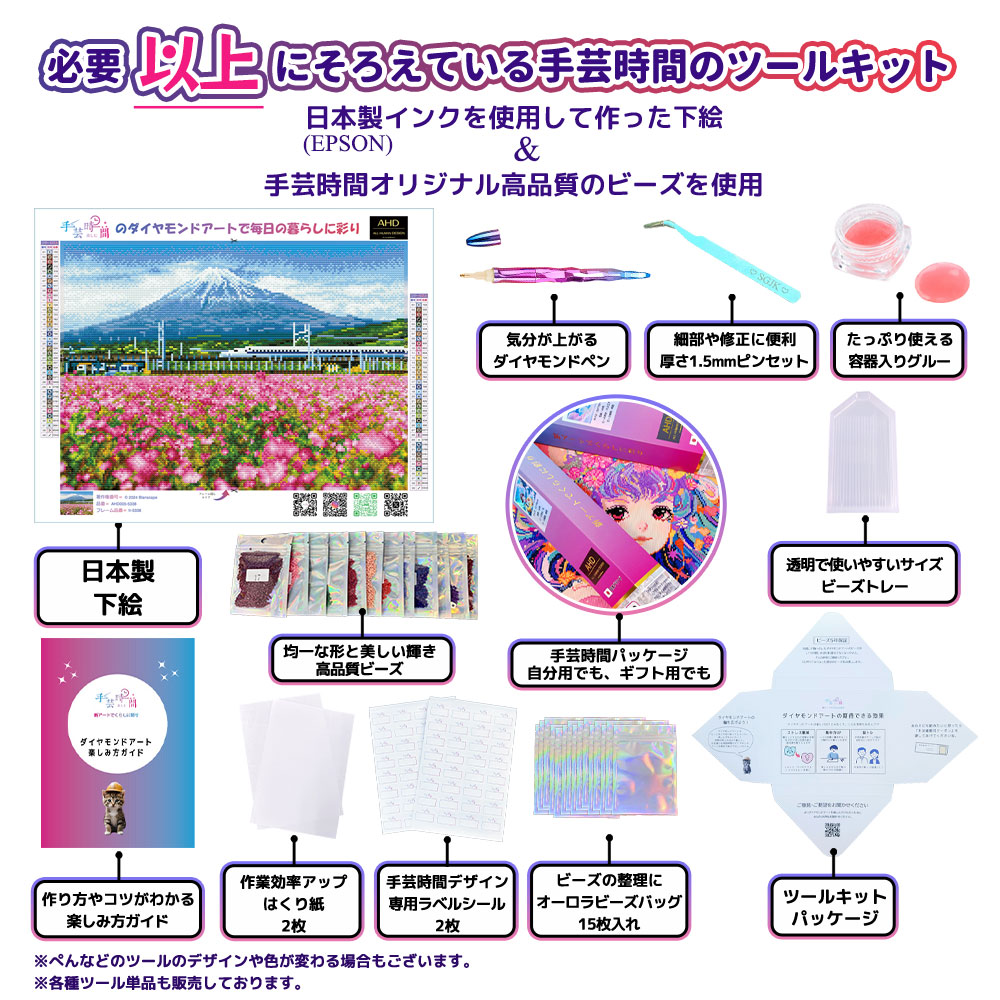 ★内容:台紙、ビーズ(丸型)、ダイヤモンドペン、ビーズトレー、容器入りグルー、ピンセット、専用ラベルシール、ビーズバッグ、はくり紙、楽しみ方ガイド