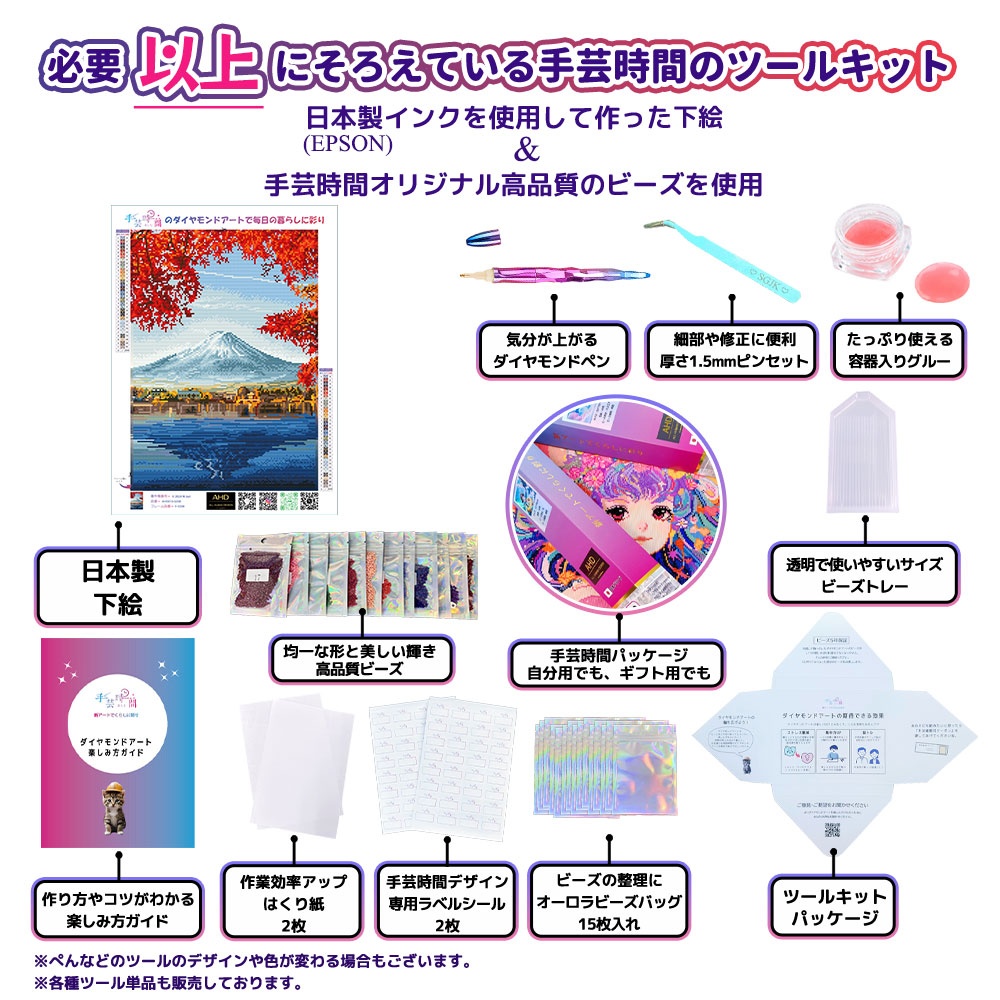 ★内容:台紙、ビーズ(丸型)、ダイヤモンドペン、ビーズトレー、容器入りグルー、ピンセット、専用ラベルシール、ビーズバッグ、はくり紙、楽しみ方ガイド