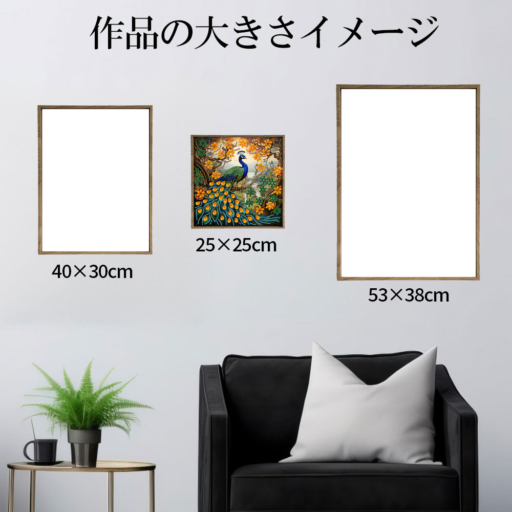 ★森の木にとまるくじゃくのノスタルジックな雰囲気の一枚。ビーズで彩ればゴージャスに。