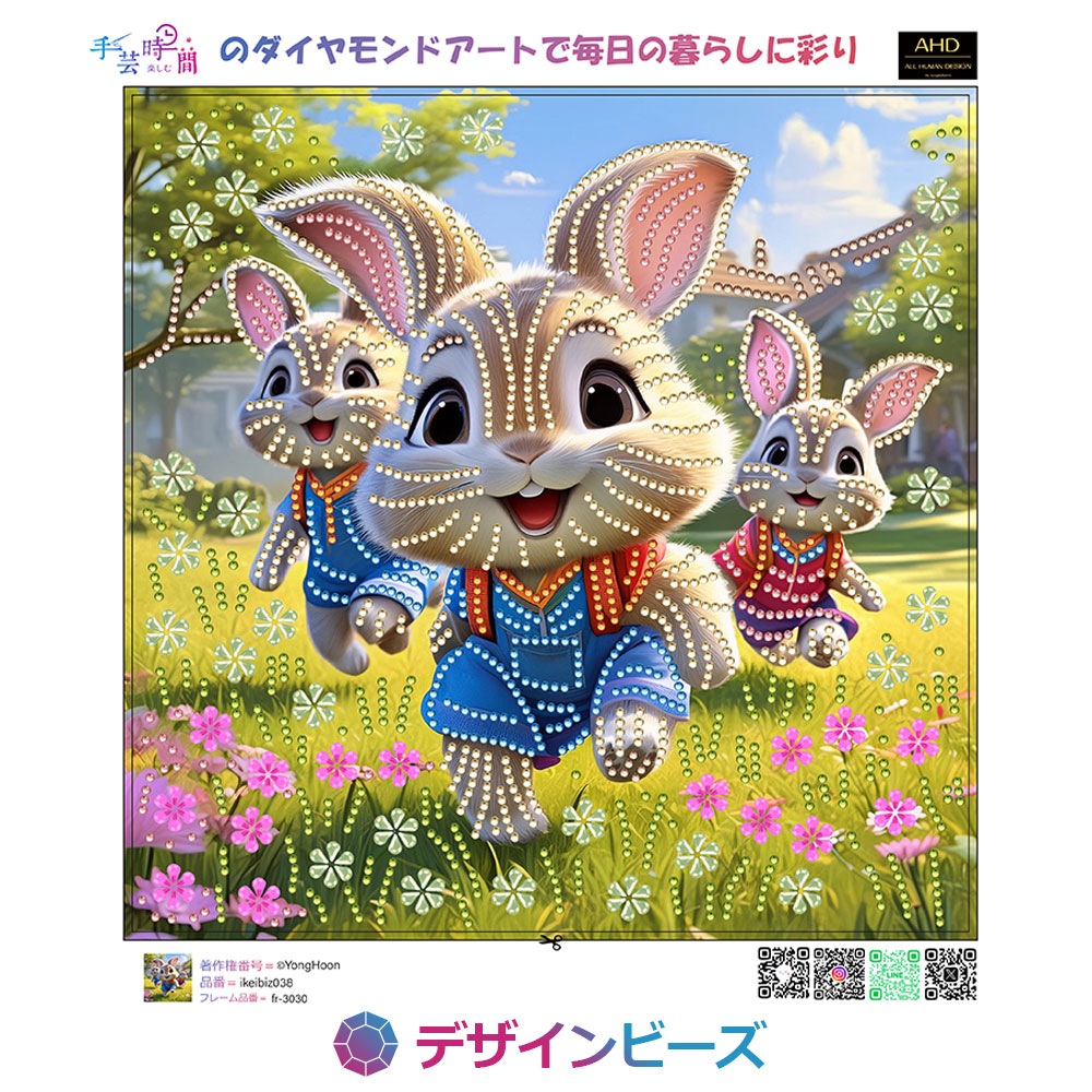 ★草原でかけっこする3羽の元気なウサギさん。ビーズでかわいく仕上げて。