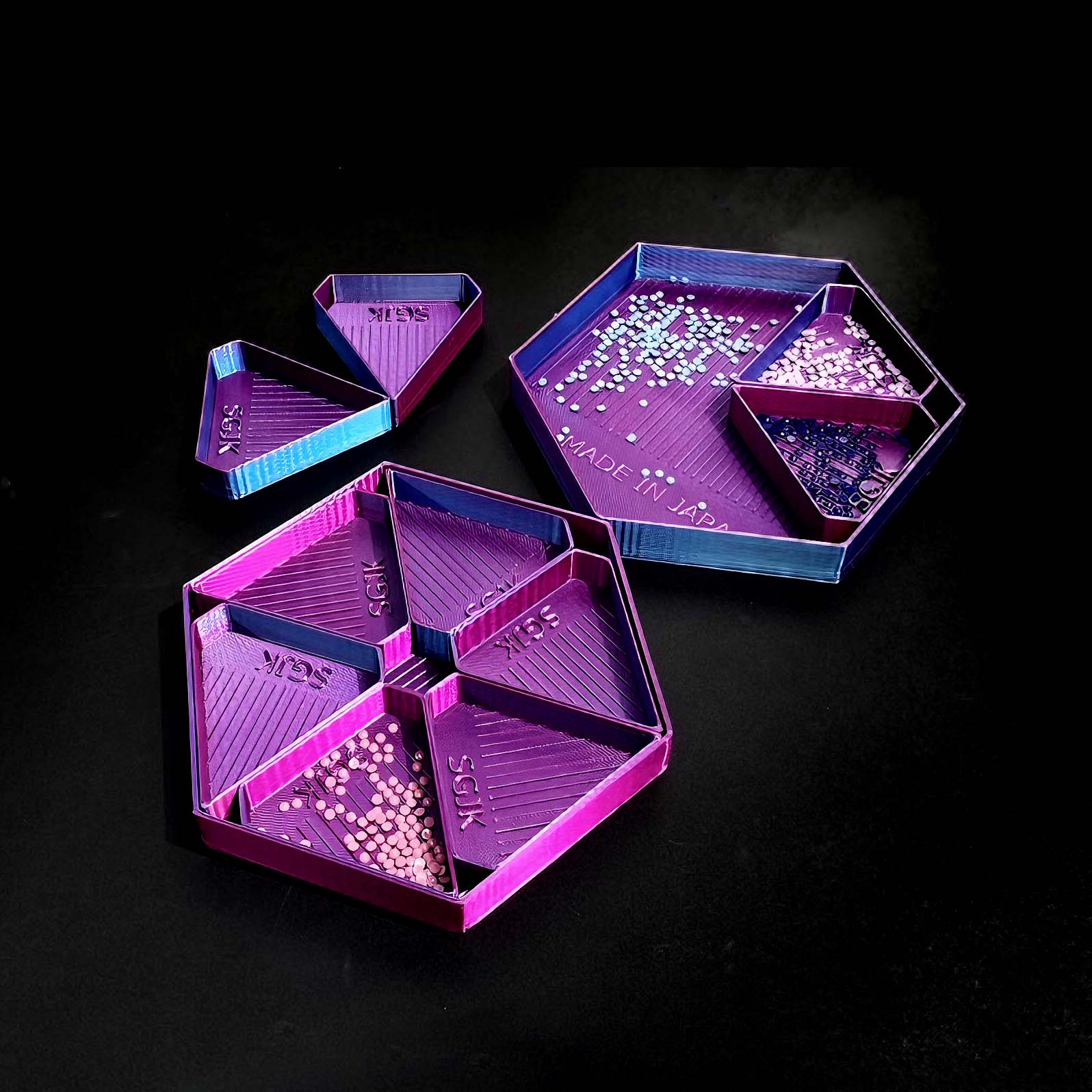 ★広い範囲のビーズを付けるときは大きな六角トレーで、細かい場所の作業は小さな三角トレーでなど、作業によってトレーを使い分けられます。